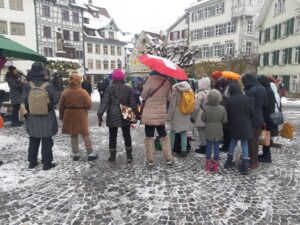 Singen in der Stadt St. Gallen – wir singen! Warm angezogen in der Winterkälte, und das Singen wird uns ebenfalls wärmen…