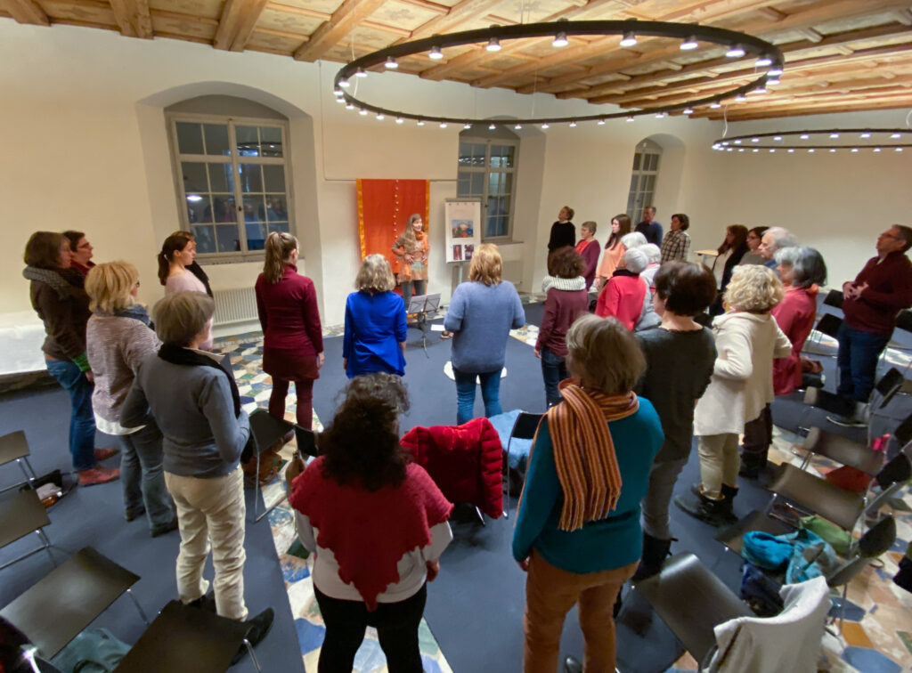 Ein Kreis von zwölf Teilnehmenden ist für ein Wochenende aus dem Alltag herausgetreten und hat sich tief in das Thema eingelassen. Das Singen von Licht-, Kraft- und Herzensliedern aus verschiedenen Kulturen und spirituellen Traditionen, Klangheilreisen, Tönen und Klingen in Verbindung mit Atem und Bewegung nach der Methode Soul Voice®, intuitives Malen, Rituale in der Natur und im Raum, innere Reisen, Stille und Dufterlebnisse (Pia Zweifel, www.piaroma.ch) haben auf der Reise begleitet. Alles Erfahrene wurde im Gestalten eines Kraft- Medizinstabes verdichtet.