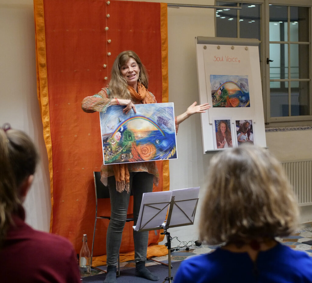 „Das Eintauchen in die Elemente, ins verbindende Miteinander mithilfe der Kraft der Klänge und der Vielfalt der Farben. Danke Sabina für dein authentisches und herzliches Wirken, es ging tief und motiviert unglaublich zum eigenen Aufblühen.“