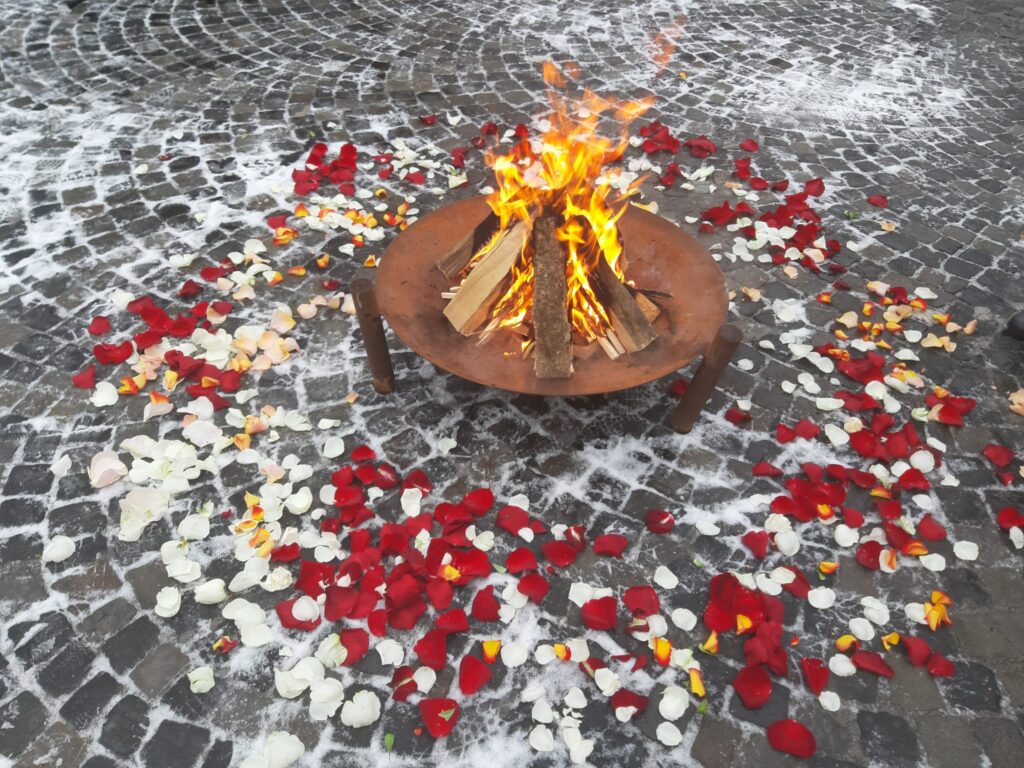 Diesmal brennt ein Feuer in der Mitte des Kreises, umgeben von Rosenblättchen als Symbol der Liebe. Ein grosser Kreis von Menschen verbindet sich im Singen von Liedern des Lichts, der Liebe, der Kraft.